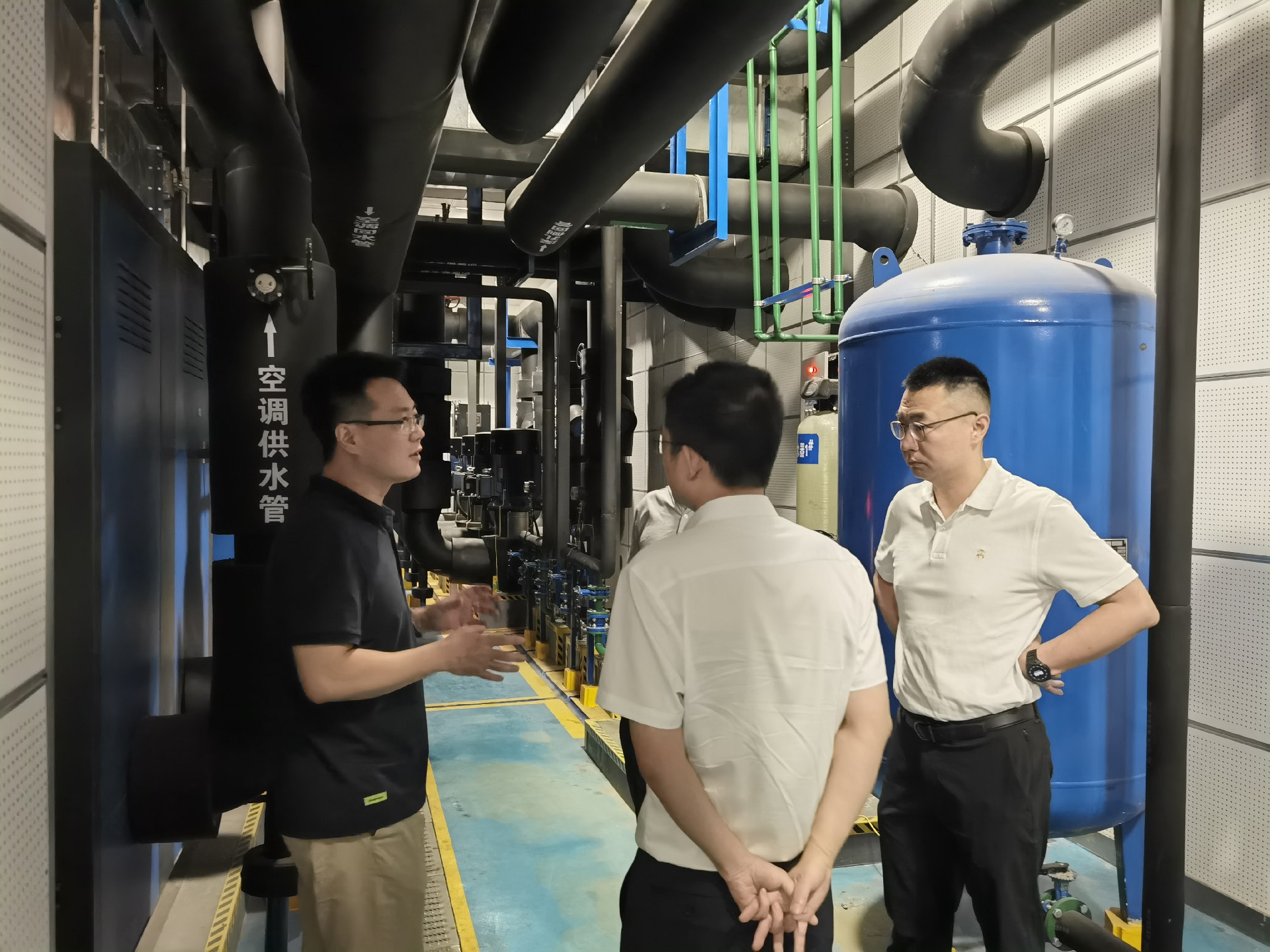 中建三局团队现场参观供热系统机房及换热孔,了解中深层地热供热的原理、系统运行效率及实际应用效果。
