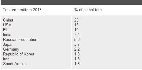 最新报告指出,中国目前是世界上最大的碳排放国,其2013年碳排放量占全球总量的27.7%,接下来依次是美国(14.4%)、欧盟(9.6%)和印度(6.6%)。