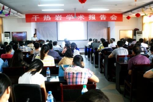 干热岩是一般温度大于150℃,埋深数千米,内部不存在流体或仅少量地下流体的高温岩体。这种岩体的成分可以变化很大,绝大部分为中生代以来的中酸性侵人岩。通过水热能交换获得的高温气体可用于工业发电,具有资源量大、零污染排放、安全性好、热能连续不受季节制约、利用率高、成本低等特点,是一种可以广泛利用,无污染的清洁可再生新能源。图为报告会场景。